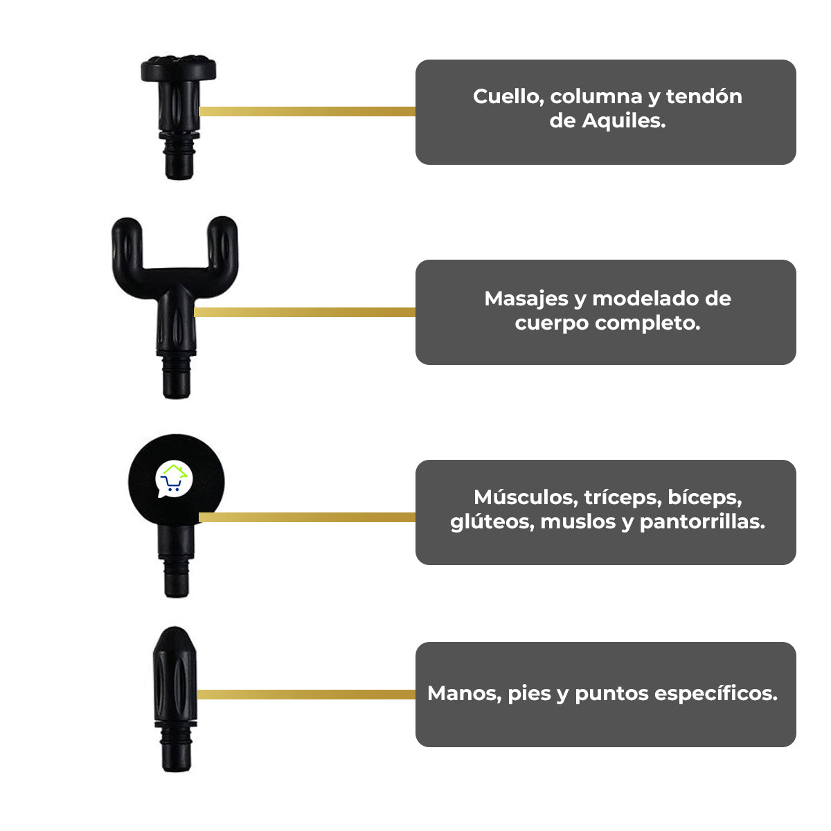 - Ajusta la intensidad del masaje con sus múltiples velocidades y elige entre una variedad de cabezales intercambiables para satisfacer tus necesidades específicas de masaje.